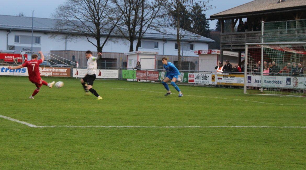 Einen direkten Torschuss von Oberbergkirchens Johannes Schweiger, der von Lukas Sehorz auf die Reise geschickt worden war, konnte Buchbachs Torwart Marvin Thormann mit einer Glanzparade parieren (66.).