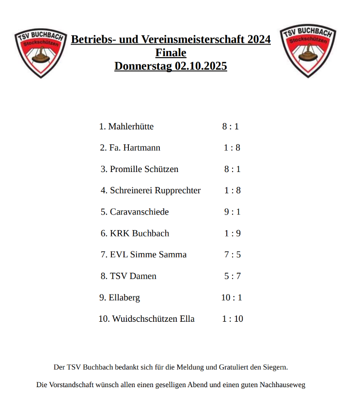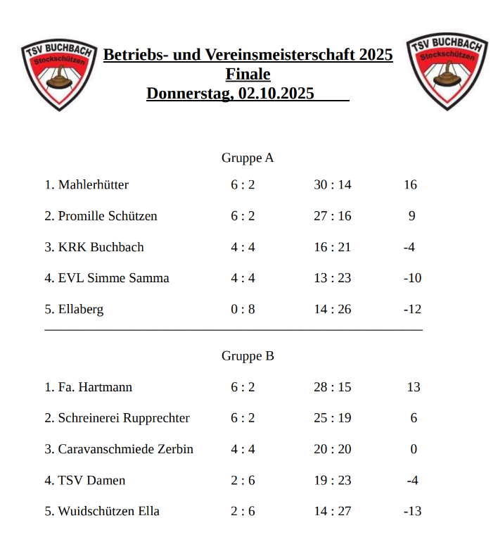 B-Klassen Meister wurde 2025 die Mannschaft Glückspilze mit den Schützen Zerbin Rosi, Klein Fini, Hußeck Heinz, Hußeck Kilian, Neumeier Konrad, Zerbin Uschi, Bögl Alex