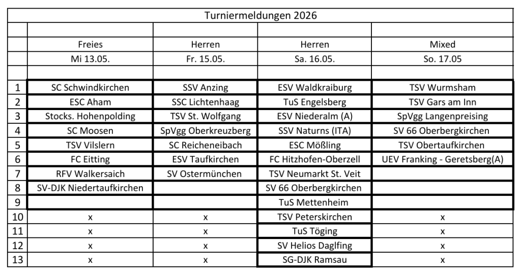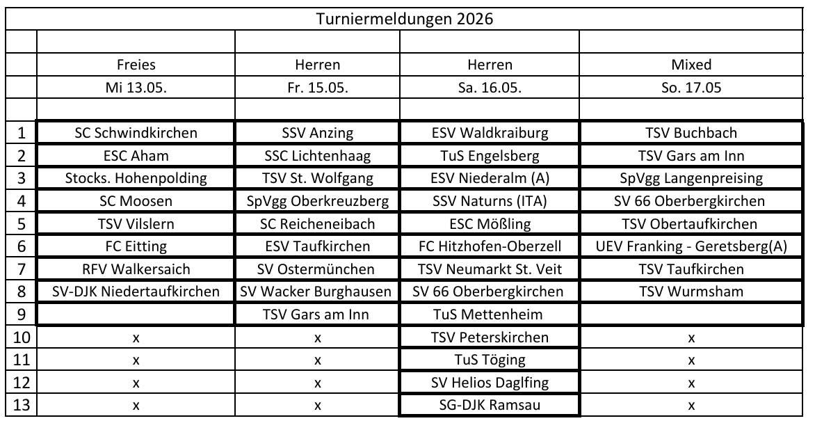 *Bei schlechtem Wetter wird das 13er am Samstag in zwei Hallen gespielt 2x 7er doppel